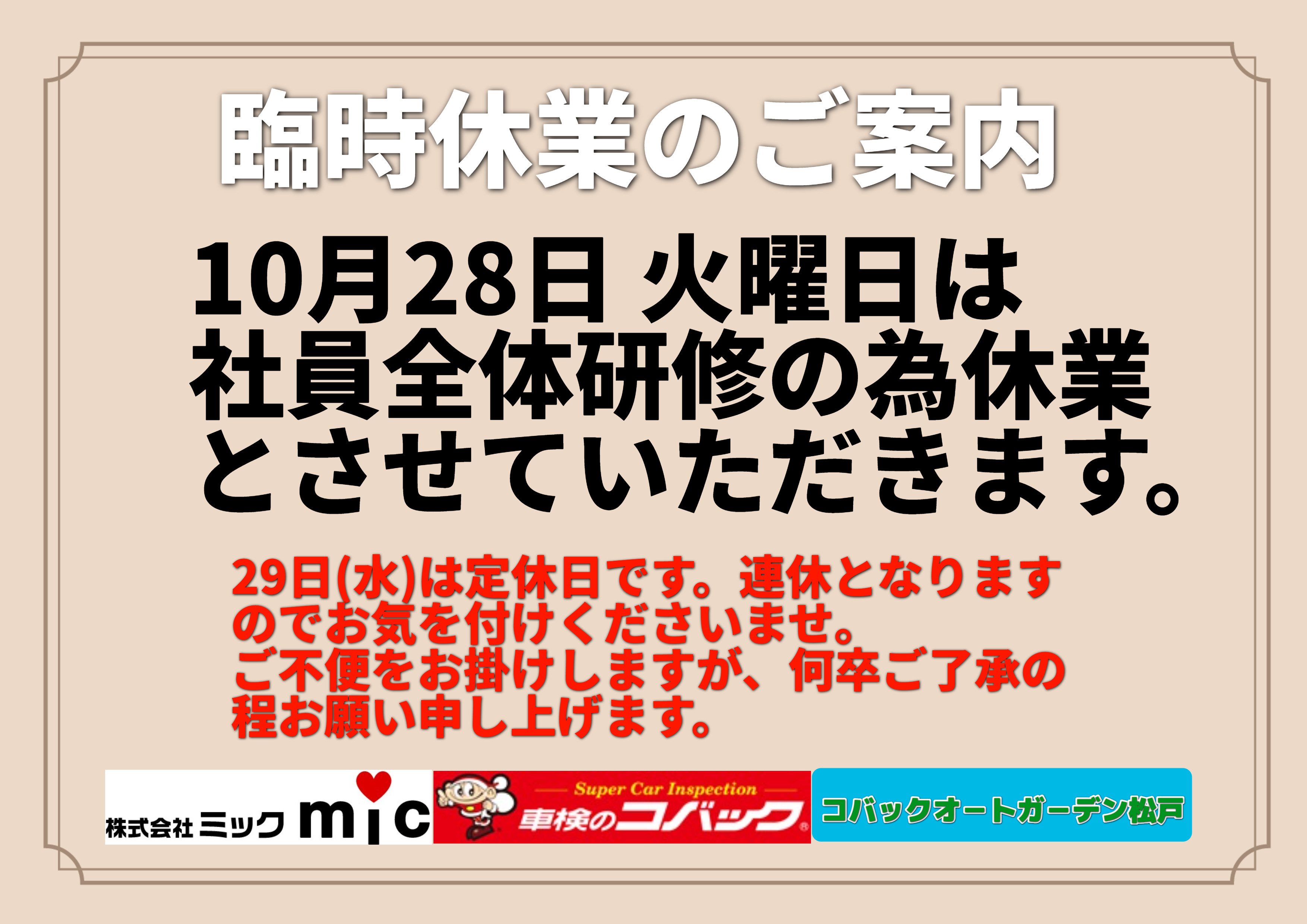 臨時休業のお知らせ 2025.10.07 ニュース 臨時休業のご案内。 10月28日 火曜日は社員全体研修の為休業とさせていただきます。 翌日29日は水曜日は定休日ですので連休となります。 ご不便をお掛けしますが、ご了承の程お願い申し上げます。 ALLすべて CAMPAIGNキャンペーン NEWSニュース EVENTイベント VARIOUS-WAYS-TO-ENJOY-CARS-STAFF-BLOG車の楽しみ方についていろいろ スタッフのブログ BACK TOP NEXT